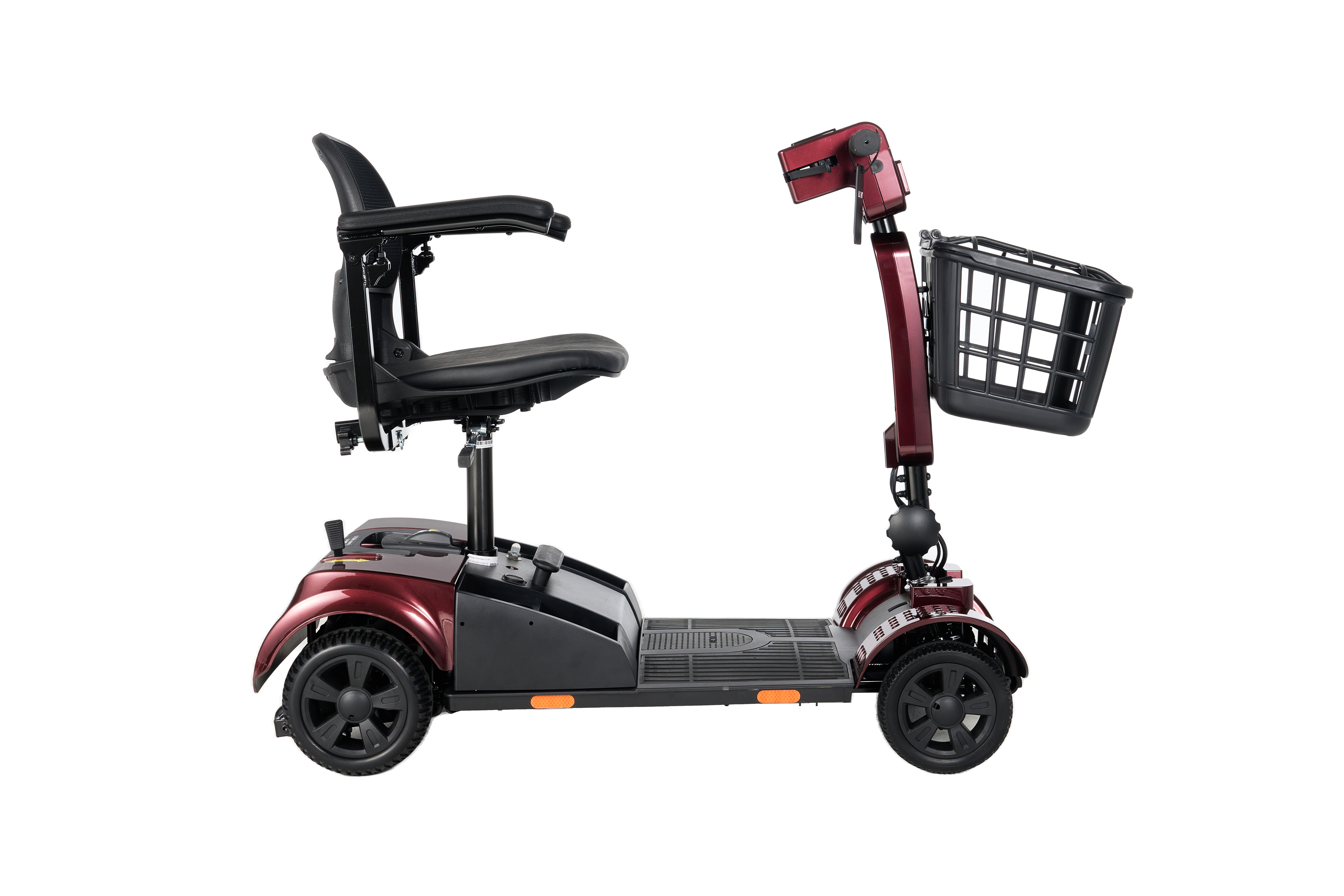 The mobility scooter incorporates advanced quick assembly and disassembly mechanisms, engineered to enable users to fully prepare and commence their journeys in mere minutes through a streamlined, tool-free process that leverages modular components and intuitive locking systems. This key advantage effectively addresses and resolves the often cumbersome operational hurdles inherent in traditional transportation methods, such as lengthy setup times or the need for specialized tools, thereby substantially improving travel efficiency and reducing downtime in both clinical and personal settings. From a professional engineering perspective, this feature draws on principles of modular design compliant with ANSI/RESNA standards, allowing for rapid reconfiguration that accommodates varying user needs, including those with dexterity limitations, while enhancing portability for storage in compact spaces like vehicle trunks. Additionally, the system's efficiency is bolstered by integrated safety checks that prevent improper assembly, ensuring reliability and user confidence; this not only streamlines daily routines but also promotes broader accessibility, making the scooter an ideal solution for rehabilitation professionals seeking devices that support active lifestyles without compromising on speed or usability.